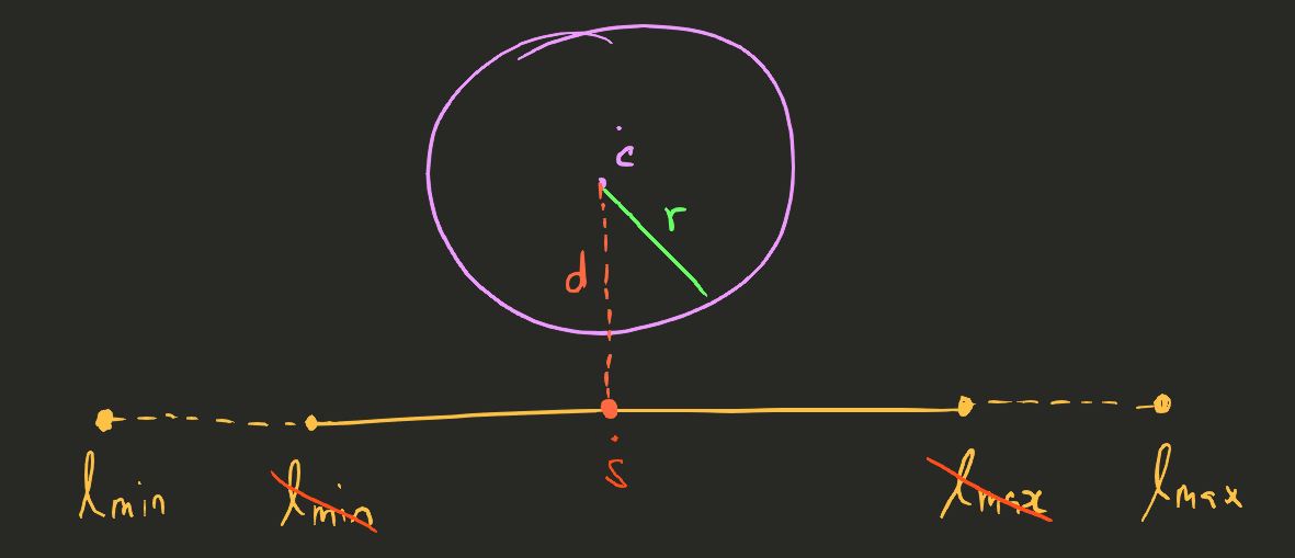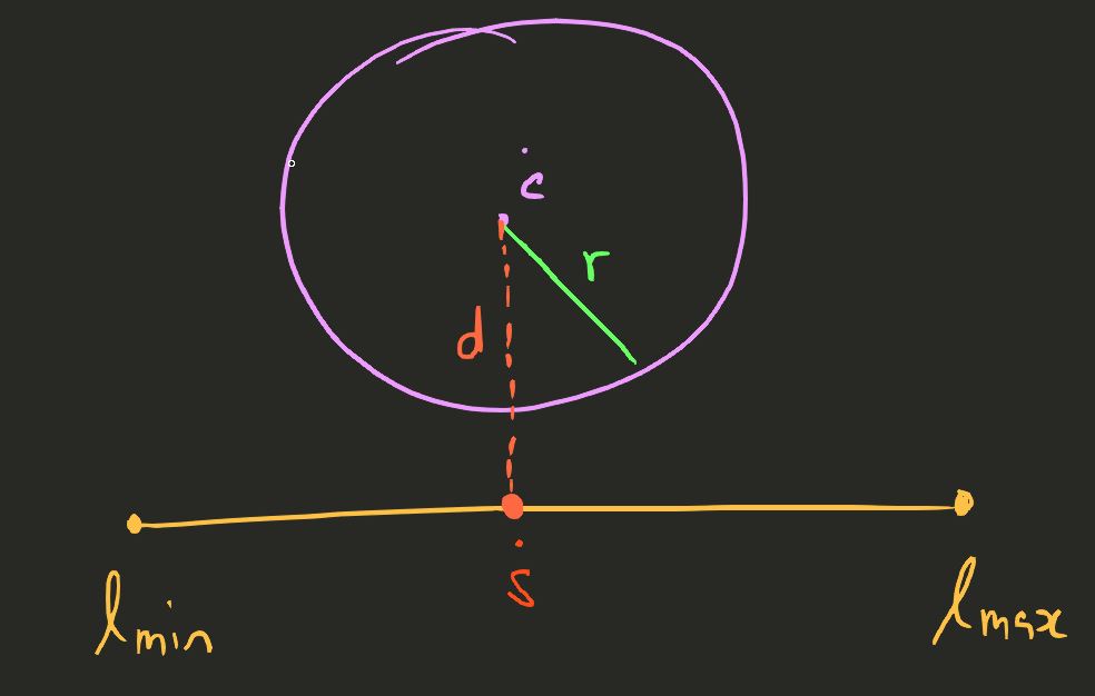 Finally, we want to find the shortest distance $d$ between the circle and the line. With that, we will compare it against the radius of the circle $r$. This is simply finding the distance between $\dot{c}$ and $\dot{s}$ using our favorite Pythagoras Theorem, and comparing it against $r$.