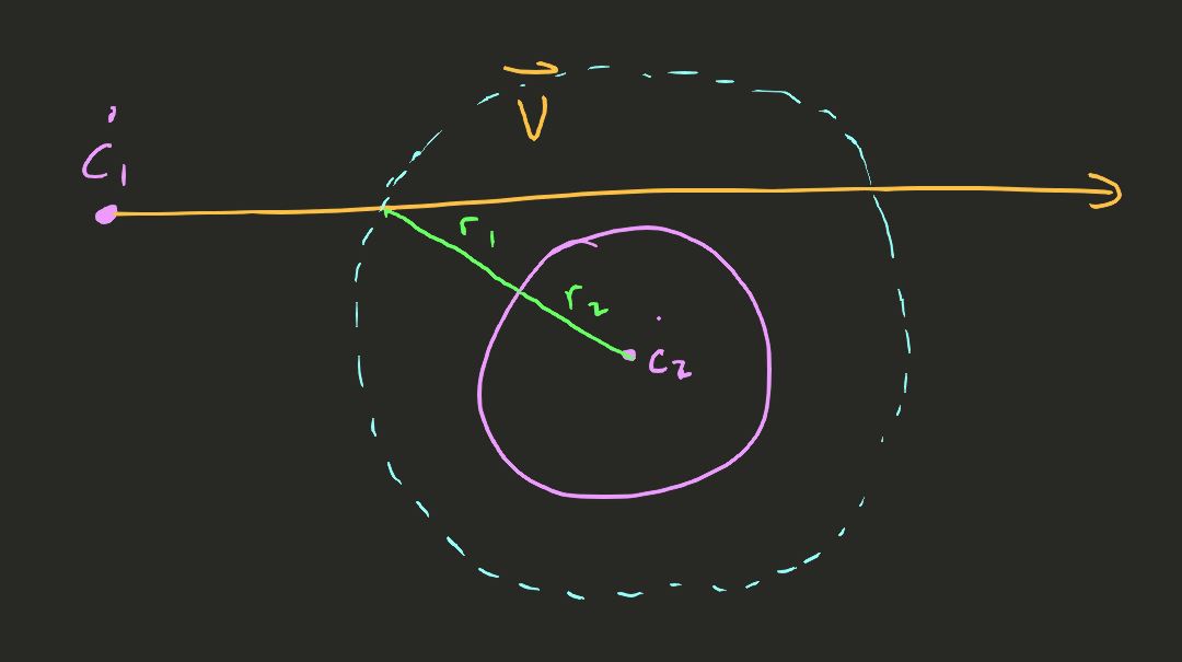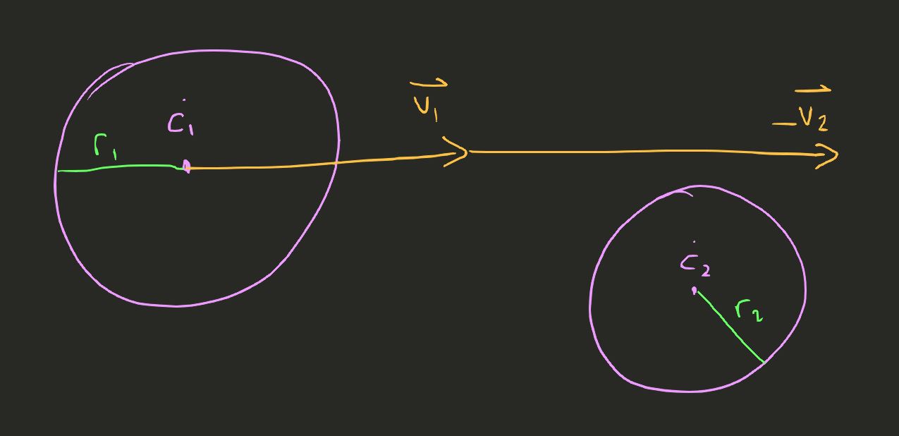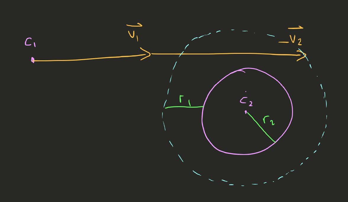 In this case, we choose to make $\dot{c_2}$ static. For this, we simply add the reverse of it's velocity $\vec{v_2}$ to the moving circle's velocity $\vec{v_1}$. It's a little unintuitive to think about especially when the circles can move at all kinds of direction (the diagram is the a simplistic example), but it is related to the idea 'relative motion'.